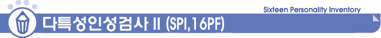 º» ´ÙƯ¼ºÀμº°Ë»çII(SPI,16PF)´Â ¼¼°èÀûÀ¸·Î ÀÎÁ¤¹Þ´Â CattellÀÇ 16PFÀÇ ÀÌ·ÐÀ» Åä´ë·Î Ç¥ÁØÈ­ÇÑ °Ë»çÀÌ¸ç ¿äÀκм®¹ýÀ» ÅëÇÏ¿© 1Â÷ ¿äÀÎ 16°¡Áö ¼º°ÝƯ¼º°ú 2Â÷ ¿äÀÎÀ¸·Î 6°¡Áö ¼º°ÝÀ¯ÇüÀ» ÃßÃâÇÑ ¼º°Ý°Ë»ç·Î½á ÀϹÝÀûÀÎ ¼º°Ý »Ó¾Æ´Ï¶ó ¸ðµç ¹üÁÖÀÇ ¼º°ÝƯ¼ºÀº ¹°·Ð ÀÓ»óÀå¸é¿¡¼­ÀÇ ºÎÀûÀÀ Çൿ±îÁö º¯º°ÇØÁÖ´Â ¼º°Ý °Ë»çÀÔ´Ï´Ù. ÀÌ °Ë»ç °á°ú´Â ÇлýµéÀÇ ¼º°Ý Áöµµ¿Í »ýȰ Áöµµ´Â ¹°·Ð Áø·ÎÁöµµ¿¡µµ ÇÊ¿äÇÑ ÀڷḦ Á¦°øÇØ ÁÖµµ·Ï Á¦ÀÛµÈ °Í»çÀÔ´Ï´Ù.