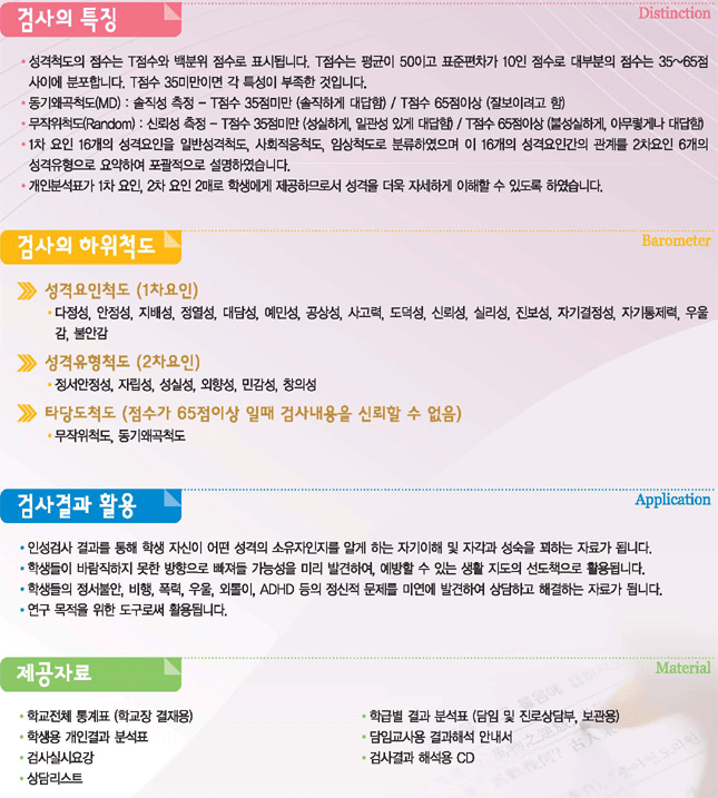 ´ÙƯ¼ºÀμº°Ë»çII(SPI,16PF)´Â ¼¼°èÀûÀ¸·Î ÀÎÁ¤¹Þ´Â CattellÀÇ 16PFÀÇ ÀÌ·ÐÀ» Åä´ë·Î Ç¥ÁØÈ­ÇÑ °Ë»çÀÌ¸ç ¿äÀκм®¹ýÀ» ÅëÇÏ¿© 1Â÷ ¿äÀÎ 16°¡Áö ¼º°ÝƯ¼º°ú 2Â÷ ¿äÀÎÀ¸·Î 6°¡Áö ¼º°ÝÀ¯ÇüÀ» ÃßÃâÇÑ ¼º°Ý°Ë»ç·Î½á ÀϹÝÀûÀÎ ¼º°Ý »Ó¾Æ´Ï¶ó ¸ðµç ¹üÁÖÀÇ ¼º°ÝƯ¼ºÀº ¹°·Ð ÀÓ»óÀå¸é¿¡¼­ÀÇ ºÎÀûÀÀ Çൿ±îÁö º¯º°ÇØÁÖ´Â ¼º°Ý °Ë»çÀÔ´Ï´Ù. ÀÌ °Ë»ç °á°ú´Â ÇлýµéÀÇ ¼º°Ý Áöµµ¿Í »ýȰ Áöµµ´Â ¹°·Ð Áø·ÎÁöµµ¿¡µµ ÇÊ¿äÇÑ ÀڷḦ Á¦°øÇØ ÁÖµµ·Ï Á¦ÀÛµÈ °ÍÀÔ´Ï´Ù.